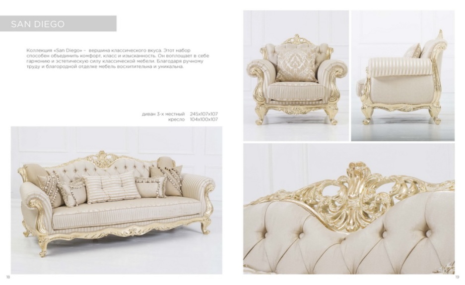 Коллекции "Сан-Диего"-вершина классического вкуса.Этот набор способен объединить комфорт,класс и изысканность.Он воплощает в себе гармонию и эстетическую силу классической мебели.Благодаря ручному труду и благородной отделке мебель восхитительна и уникальна.
