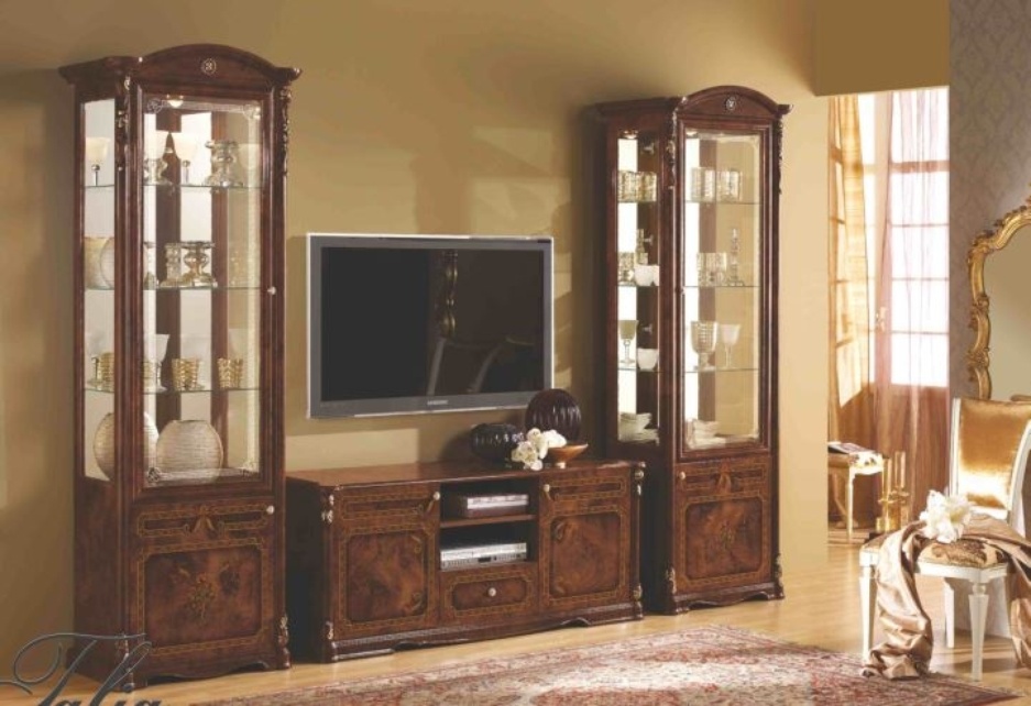 Чтобы придать внешнему виду мебели дополнительной изысканности и благородства, комплект выполнен в оттенке орех. Благодаря небольшим габаритам, мебельный набор будет одинаково хорошо смотреться как в просторных, так и небольших комнатах. Конструкция отличается водоотталкивающими свойствами и устойчивостью к появлению мелких деформаций – заслуга ламинированного ДСП и МДФ. В состав набора входит два шкафа-витрины, где можно хранить оригинальные столовые наборы, вазы и статуэтки. Центральная часть комплекта – удобная тумба под телевизор с несколькими выдвижными ящичками, в которых можно хранить диски и другую оргтехнику.